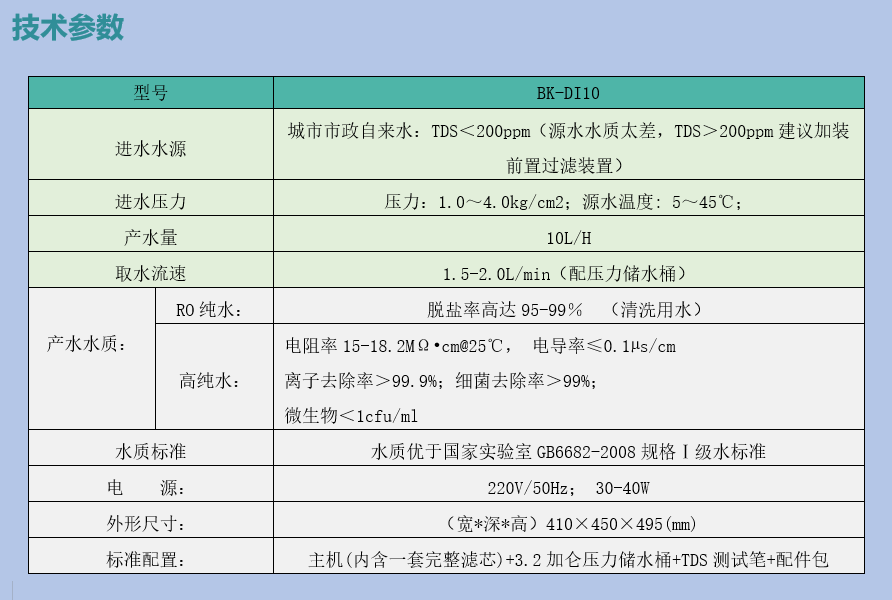 l 160*80*330mm一体化两柱纯化组模块独有的超大容量。全身柱体采用食品级 PP 材质,热熔设备一次热熔成型,无任何粘接剂,无任何杂质析出。内装优质纯化精密级树脂及核子级树脂,出水水质最高可达到 18.2MΩ·cm;