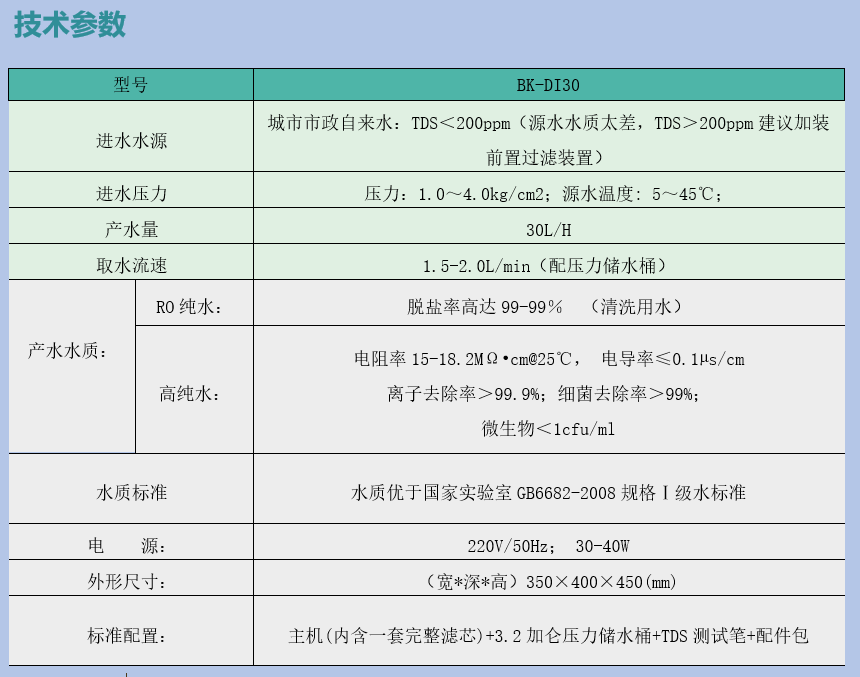 BK-DI30高纯水机具体参数